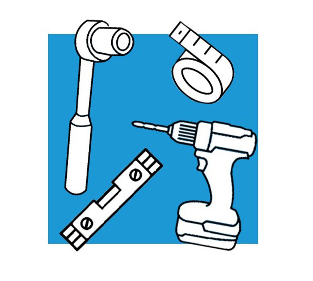 Boormachine, momentsleutel, waterpas en meetlint